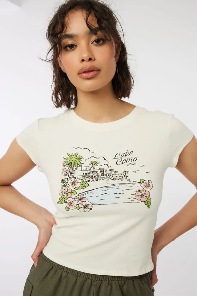Cropped t-shirt in jersey knit. Crew neck Cap sleeves Choice of prints 95% cotton, 5% spandex Model is wearing size S | Ardene Cap-Sleeve Crop Graphic Tee in White | Size XS | Spandex/Cotton