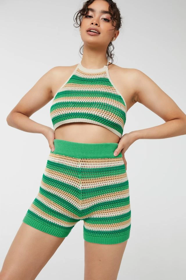 Crocheted pull-on shorts. Unlined, open crochet knit Elastic waistband Striped print 100% cotton Model is wearing Size S Wear them with the matching top: 2B-AP30650-05 | Ardene Crochet Shorts in Brown | Size XS | 100% Cotton