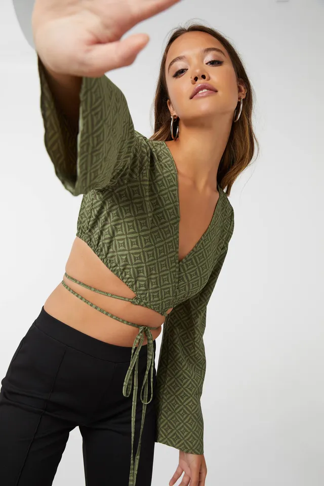 Long-sleeve woven top. Plunge V-neck Ultra-cropped length Tie strings at waist Choice of geometric prints 100% polyester Model is wearing size S | Ardene Geo Print Wrap Top in Brown | Size XS | Polyester
