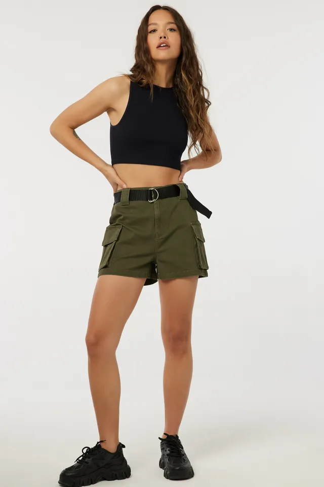 Ardene High Rise Cargo Shorts With Belt In Khaki | Size | Spandex/Cotton