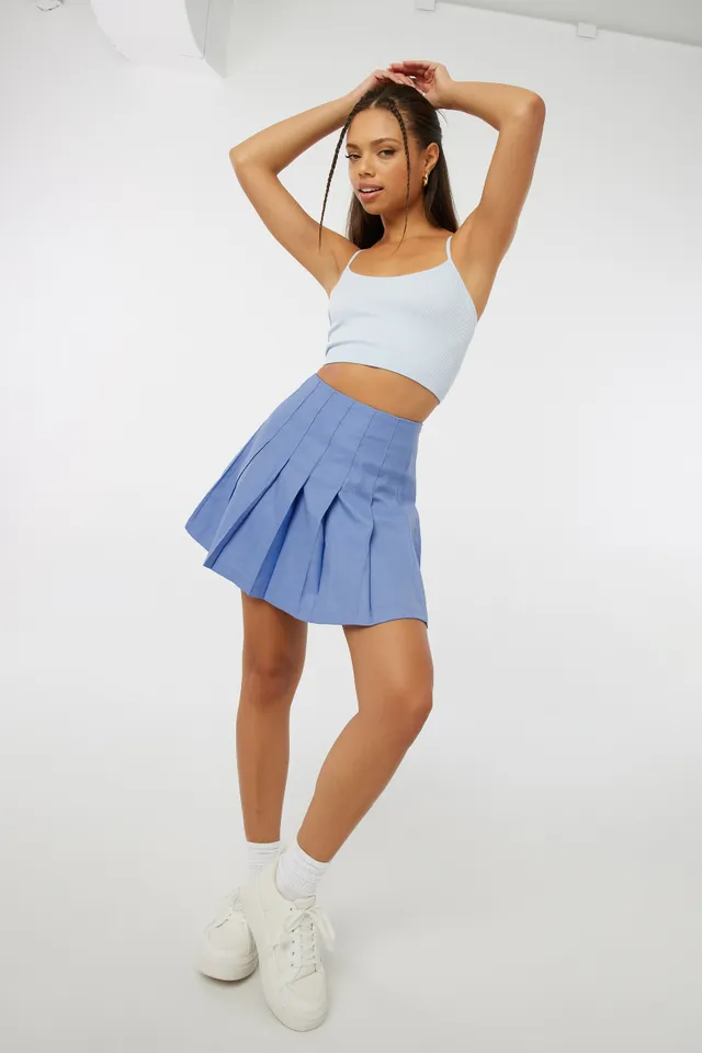 Twill micro mini skirt. Side zipper closure Choice of solids and plaid prints 57% polyester, 43% viscose Model is wearing size S | Ardene Micro Mini Pleated Skirt in Med. Blue | Size XS | Polyester/Viscose