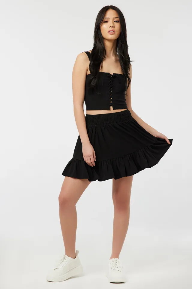 Mini crepe skirt. Smocked waist Choice of ditsy floral print or solid Black 94% polyester, 6% spandex Model is wearing Size S Wear it with the matching top: 3A-AP323775-12 | Ardene Mini Crepe Tiered Skirt in White | Size XS | Polyester/Spandex