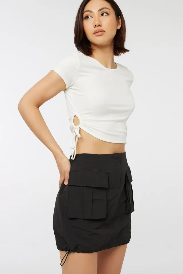 Nylon cargo mini skirt. Button and fly Cargo pockets Adjustable hem 100% nylon Model is wearing size S | Ardene Parachute Mini Skirt in Black | Size XS | Nylon