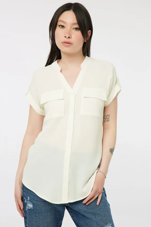 Crinkle-crepe long button-up shirt. Mao collar Short sleeves with button flap Patch pockets with flaps 95% polyester, 5 % elastane Model is wearing size S | Ardene Tunic Shirt with Mao Collar in Beige | Size XS | Polyester/Elastane