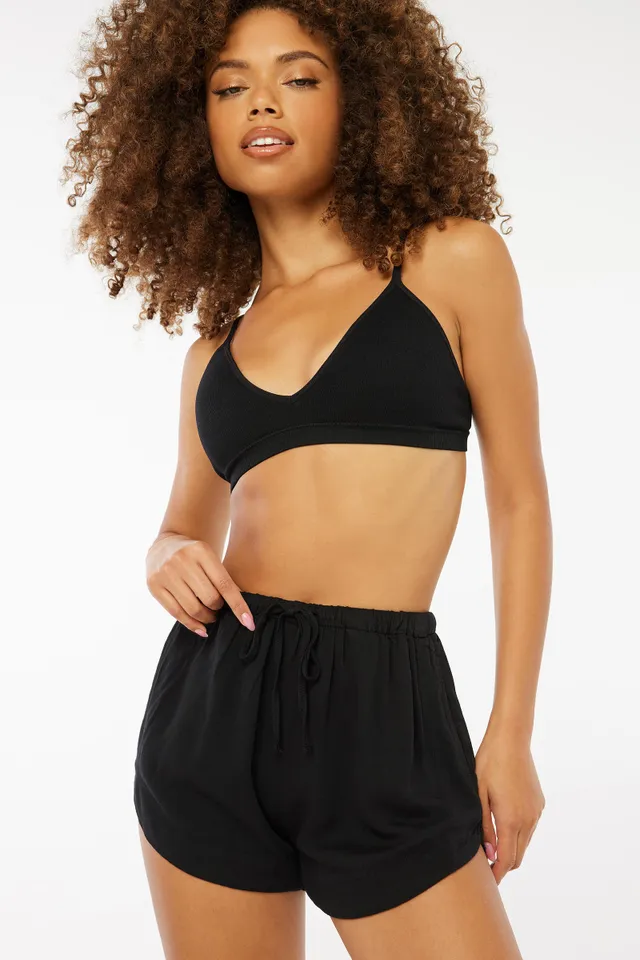 High-rise pull-on shorts. Ruched elastic waist with drawstring Side pockets Dolphin hem 100% viscose Model is wearing size S | Ardene Twill Dolphin Shorts in Black | Size XS | 100% Viscose