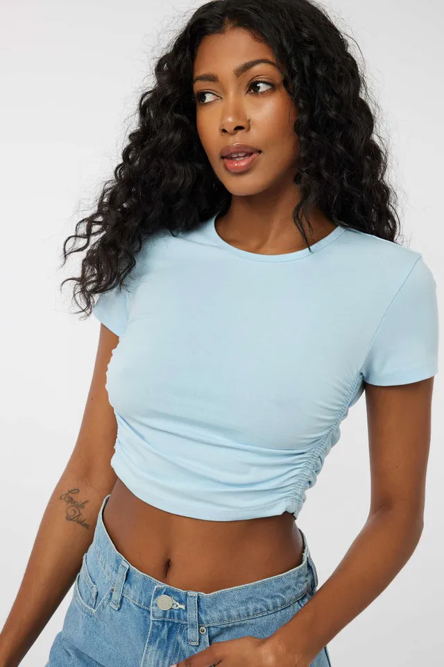 Ardene Ultra Cropped Ruched T-Shirt In Lt. Blue | Size | Spandex/Cotton